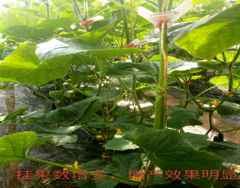 白银市北湾镇温女士,电话:13519430873使用巧农2号后黄瓜长势情况:1.比未使用巧农2号区域的黄瓜长势突出,明显高出30公分左右。2.使用巧农2号后黄瓜头部长势良好,叶色深绿肥厚。3.黄瓜挂果数量增多,增产效果明显。4.黄瓜根部变粗,根系发达。